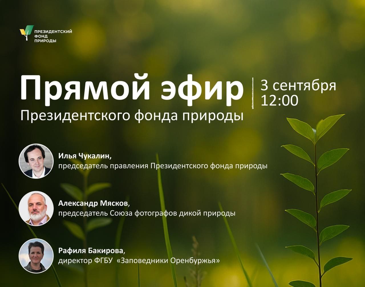 3 сентября состоялся День прямого эфира Президентского фонда природы. Спикером прямого эфира выступил член Общественного совета при Минприроды России Александр Мясков. Прямой эфир прошел на странице Фонда «ВКонтакте» и был посвящен старту конкурса экологических и природоохранных проектов 2026 года. Полная запись эфира - https://vk.com/video-229577686_456239048?list=e475f90b88e9bbd22d